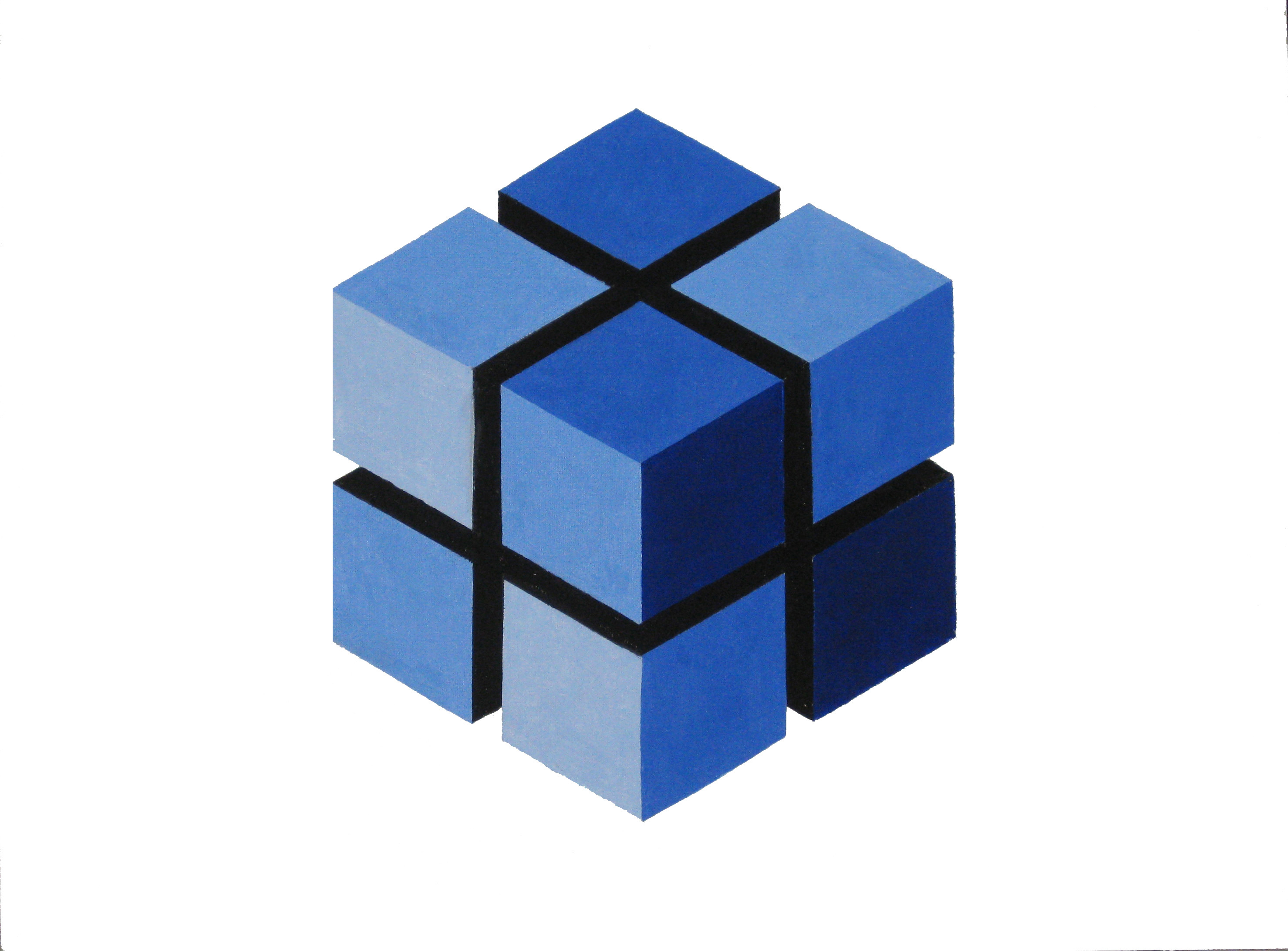 | Jetzt wird es geometrisch. Insgesamt wurden nur vier Farben vermalt, allerdings bewirken die helleren oder dunkleren Nachbarflächen, dass eine Farbe unterschiedlich wahrgenommen wird. Eine optische Täuschung. | |